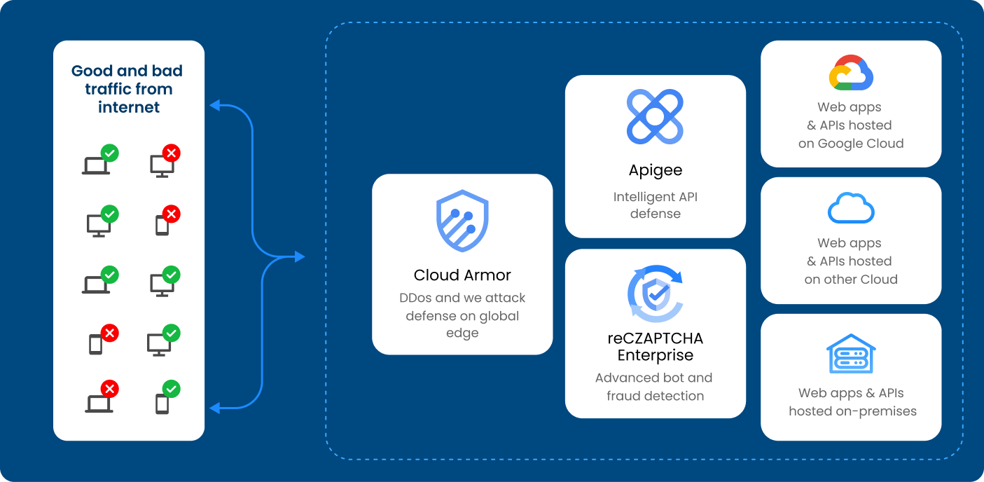 Our Google-certified architects design and manage custom Web App & API Protection solutions for threat detection and access control, offering tailored protection strategies to meet your business's unique security needs.